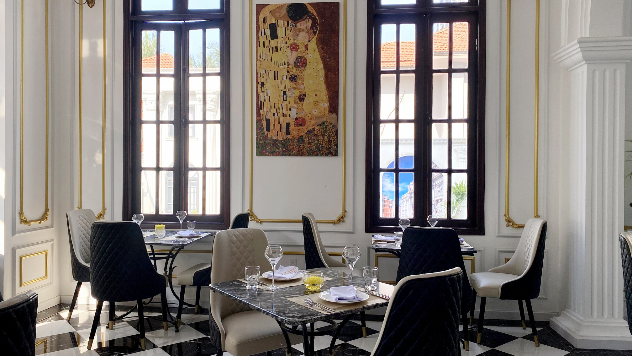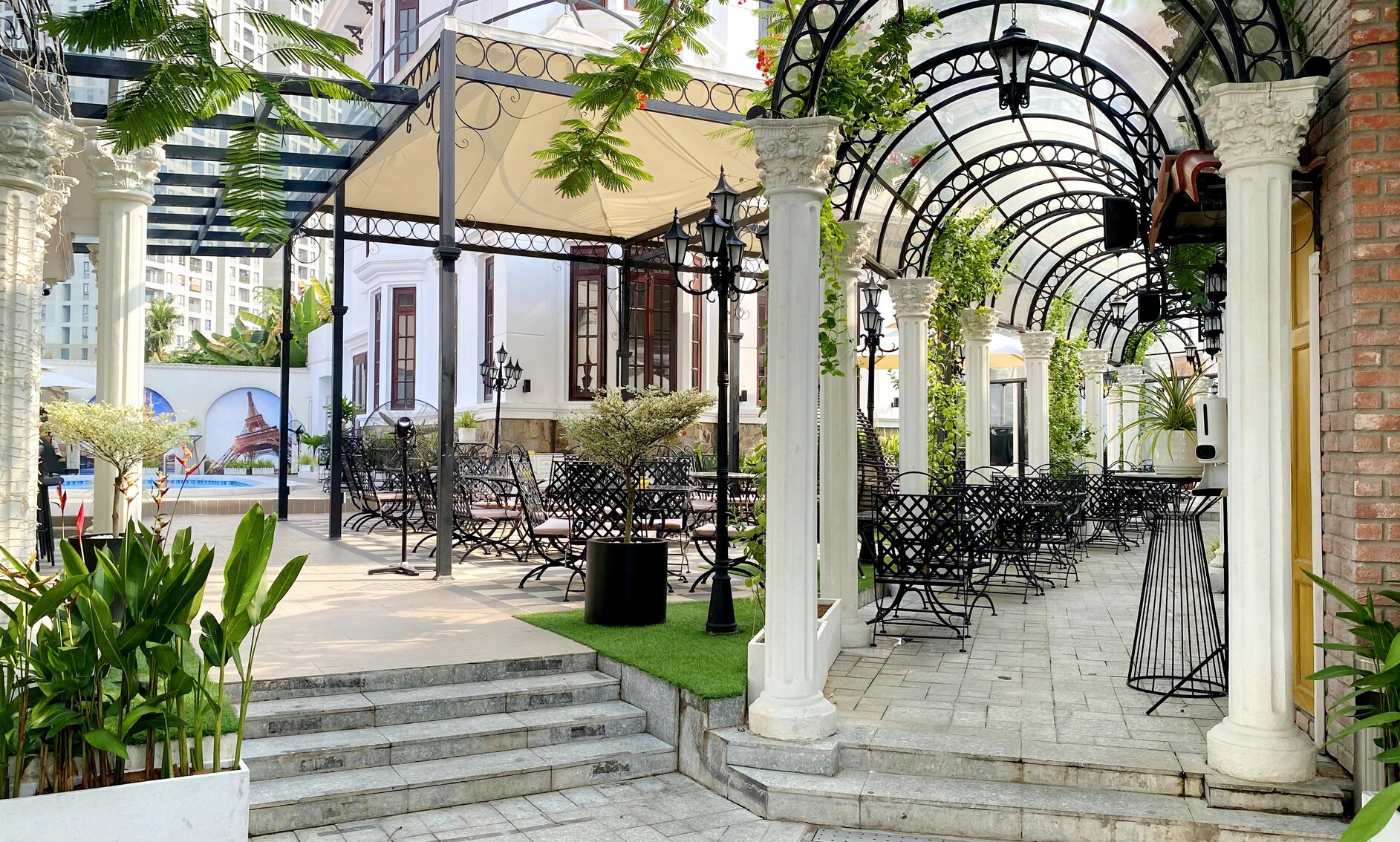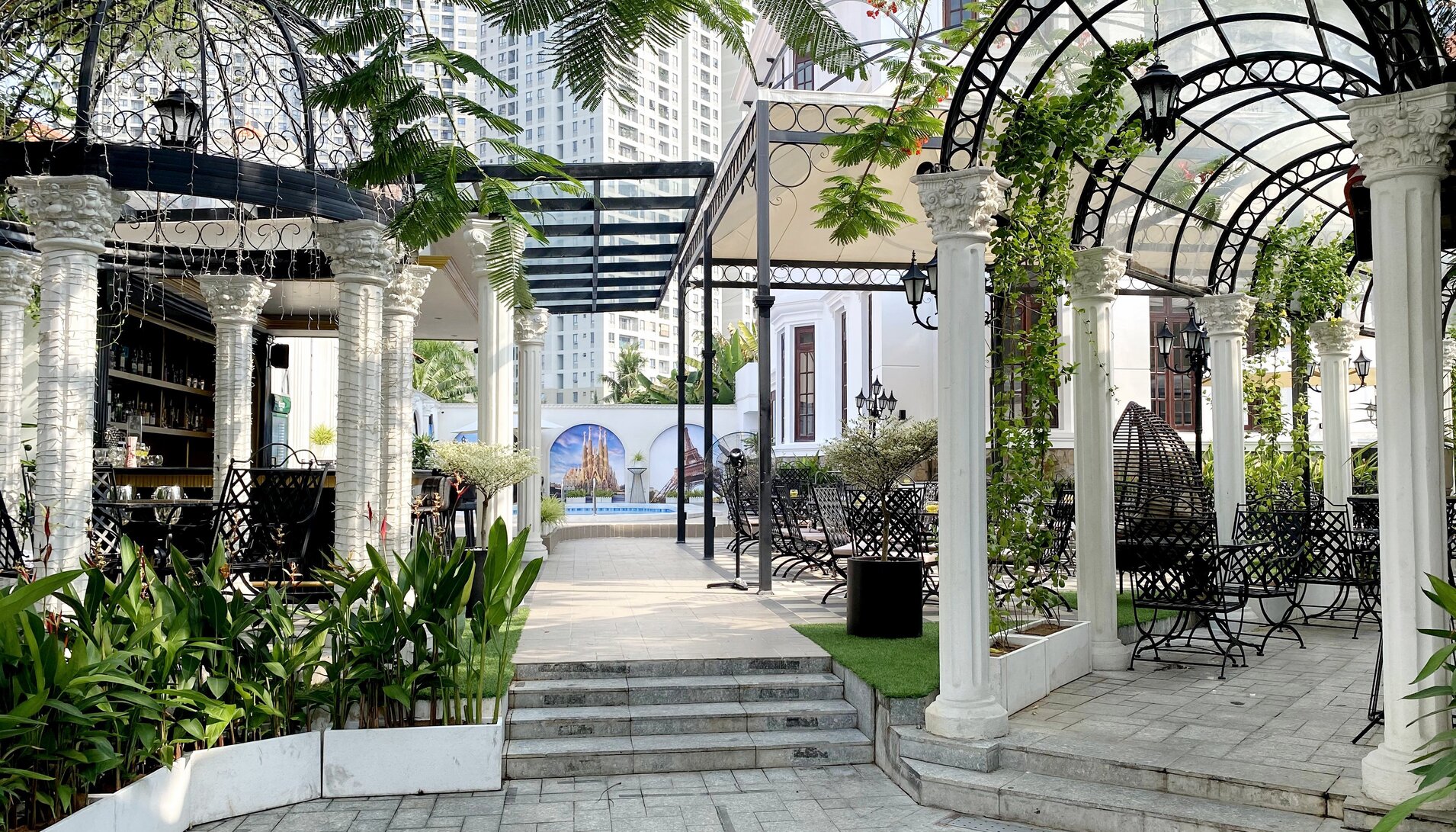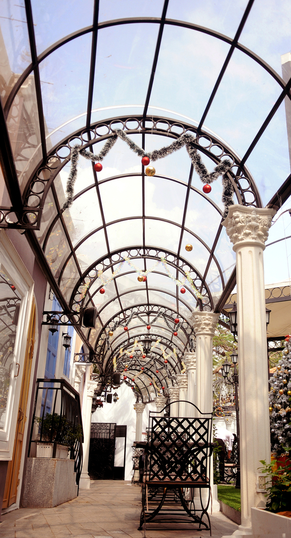 Châu Âu hoa lệ chính là mỹ từ để diễn tả khoảng không gian mở phía ngoài của nhà hàng. Được xây dựng theo kiến trúc đậm chất cổ điển với sự giao thoa của hai luồng kiến trúc Hy Lạp và Pháp, thực khách sẽ cảm thấy mình đang thực sự lạc vào xứ sở Châu Âu thơ mộng. Đây sẽ là sự lựa chọn hoàn hảo cho việc thưởng thức bữa tối tuyệt hảo bên người yêu thương giữa những giai điệu du dương và ánh đèn lấp lánh.