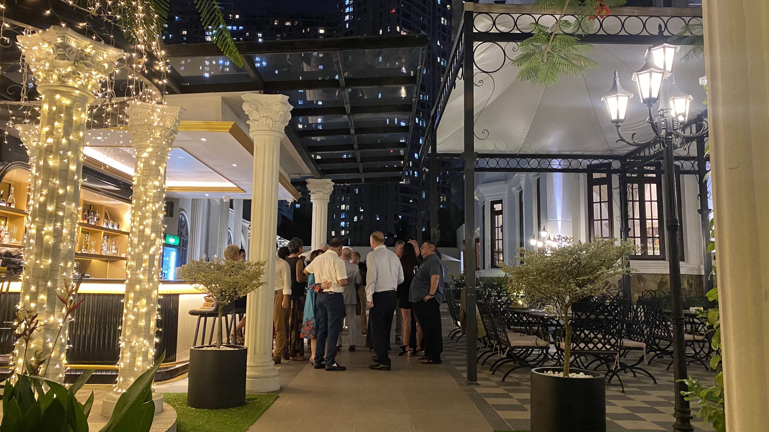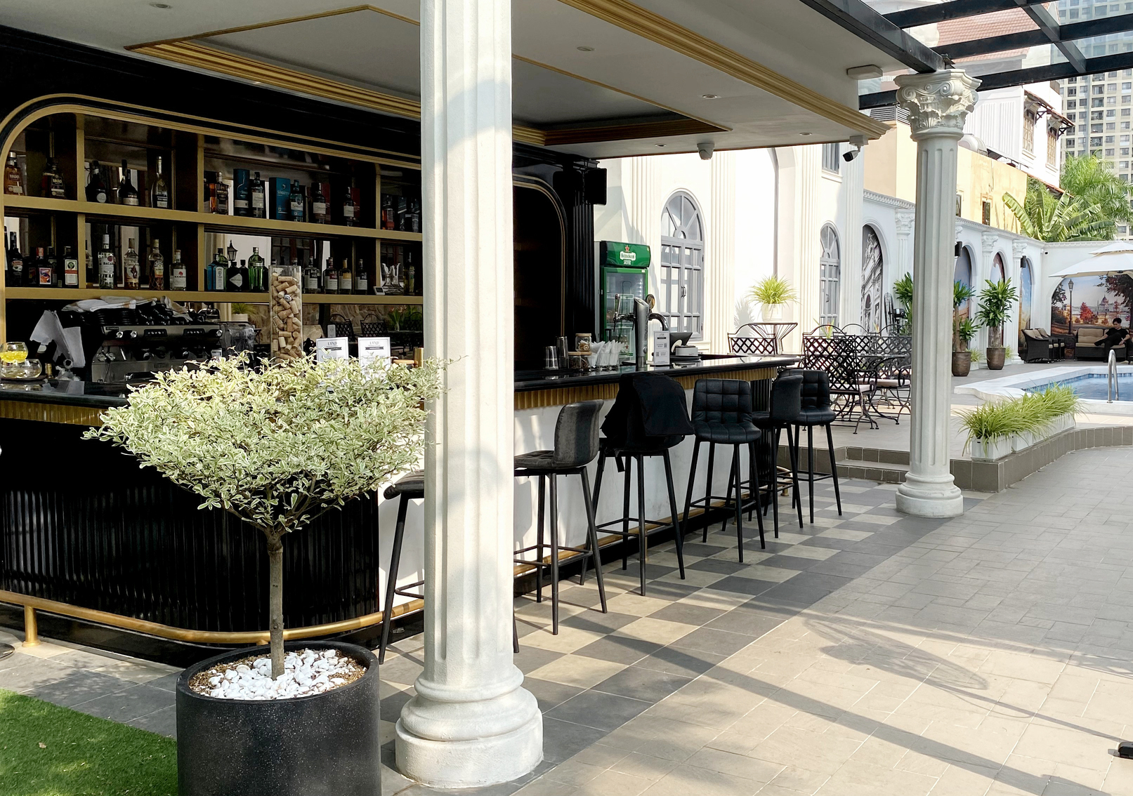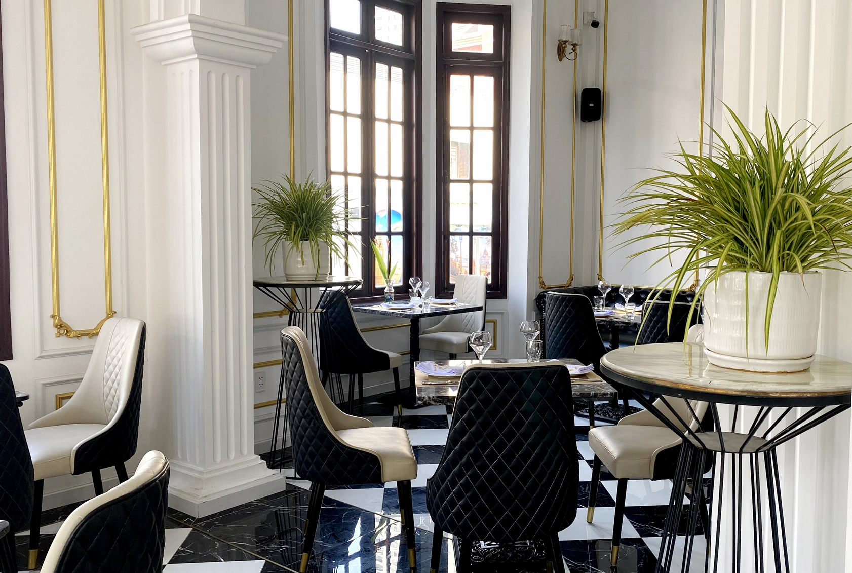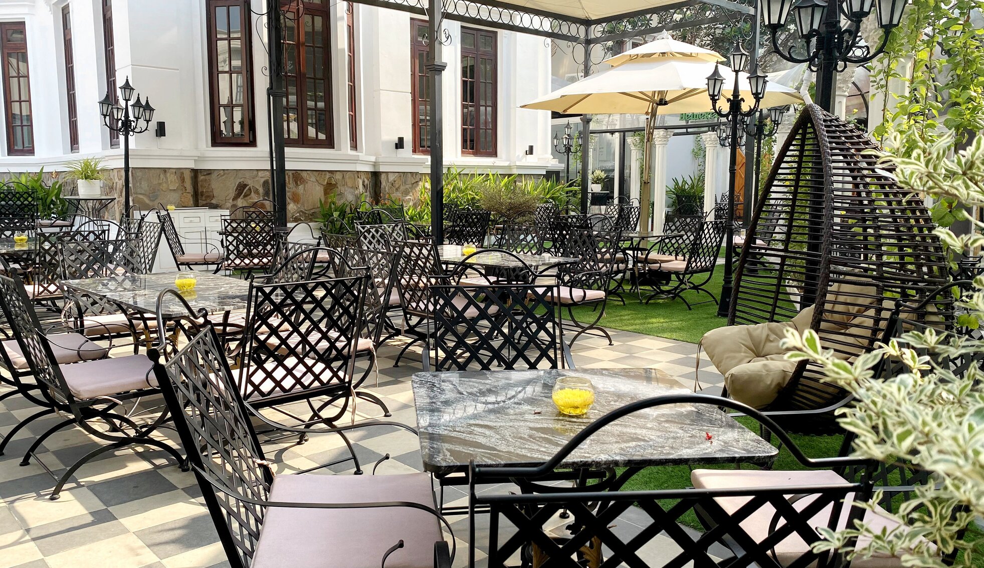 Châu Âu hoa lệ chính là mỹ từ để diễn tả khoảng không gian mở phía ngoài của nhà hàng. Được xây dựng theo kiến trúc đậm chất cổ điển với sự giao thoa của hai luồng kiến trúc Hy Lạp và Pháp, thực khách sẽ cảm thấy mình đang thực sự lạc vào xứ sở Châu Âu thơ mộng. Đây sẽ là sự lựa chọn hoàn hảo cho việc thưởng thức bữa tối tuyệt hảo bên người yêu thương giữa những giai điệu du dương và ánh đèn lấp lánh.